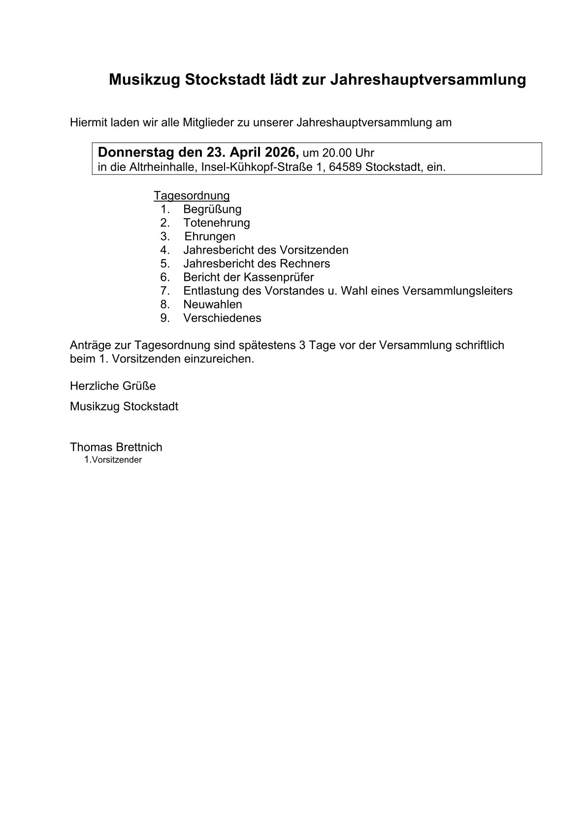 Der Musikzug Stockstadt wurde im Jahr 1976 gegründet und zählt derzeit etwa 35 aktive Mitglieder. Als Brass-Band tritt das Ensemble auf und hat bereits bedeutende Erfolge bei verschiedenen Meisterschaften errungen, darunter der Titel "Hessischer Meister" und der zweite Platz bei den "Deutschen Meisterschaften" in der Brass-Band-Klasse. Durch Auftritte im Ausland hat der Musikzug auch international Anerkennung erlangt und seine musikalische Qualität unter Beweis gestellt. Der Verein legt großen Wert auf musikalische Vielfalt und pflegt ein breites Repertoire, das von traditioneller Volksmusik bis hin zu zeitgenössischen Kompositionen reicht. Zudem engagiert sich der Musikzug aktiv in der lokalen Gemeinschaft durch regelmäßige Auftritte bei Veranstaltungen und Festlichkeiten, um die Freude an Musik zu teilen und das kulturelle Leben zu bereichern.